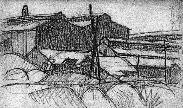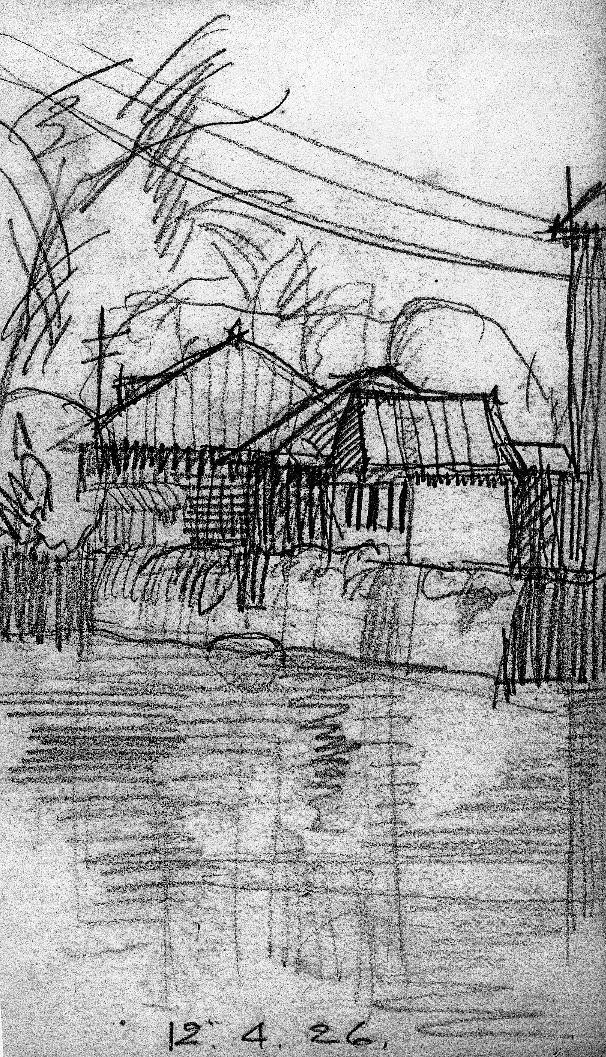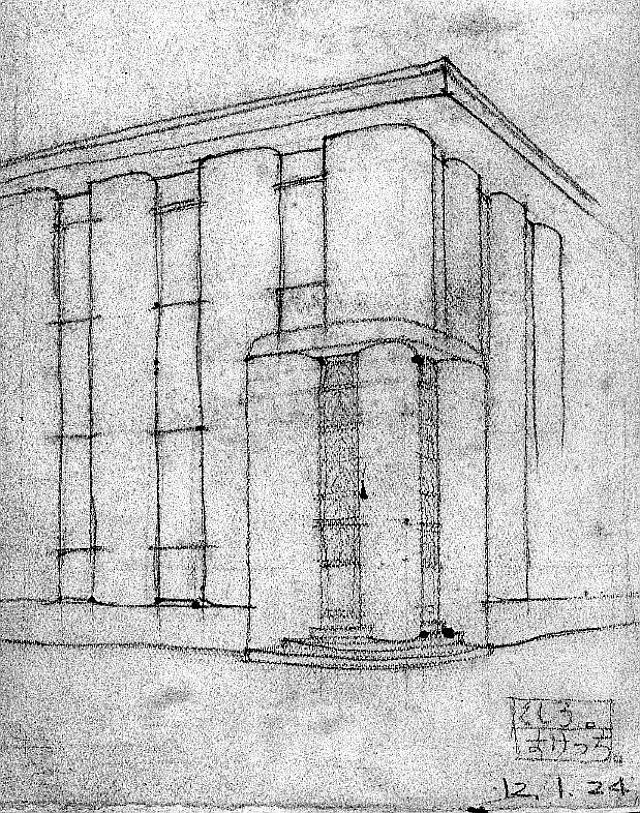 山口の遺品に古ぼけたスケッチブック(11×18センチ)があり、なかに「くしろ すけっち 12.1.24」とある釧路郵便局らしい建築ファサードの鉛筆描きスケッチパースがある(下図)。他にも大正12年1月から7月の書き込みのスケッチ数葉などがあるほか、日本建築史の講義らしいメモ書き、短歌、歌舞伎舞台スケッチ、「聴講願」等がある。