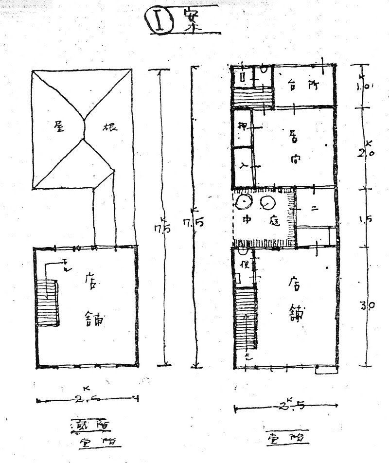 こゝに紹介する、商店は内務省告示第十四号地域圖に於ける住宅地域に建てられる住宅附の店舗であります。で甲乙両種の防火地域に建てるには充分なる防火装置を施さなければなりませんがここでは防火地図外に建てられるものとして考へて行きませう.。