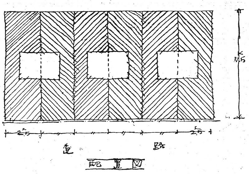 先きへ書くことを忘れましたが、この家は一軒独立して建てても、また、圖に示す如く四軒乃至は六軒を連続とし、一棟としても、その敷地の都合で何れを取るも結構と考へます。只連績の場合には中庭の関係によりまして、採光は幾分助けられることになりますし、亦工事費は独立一軒のものに比して遥かに低廉であるでせう。