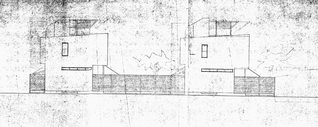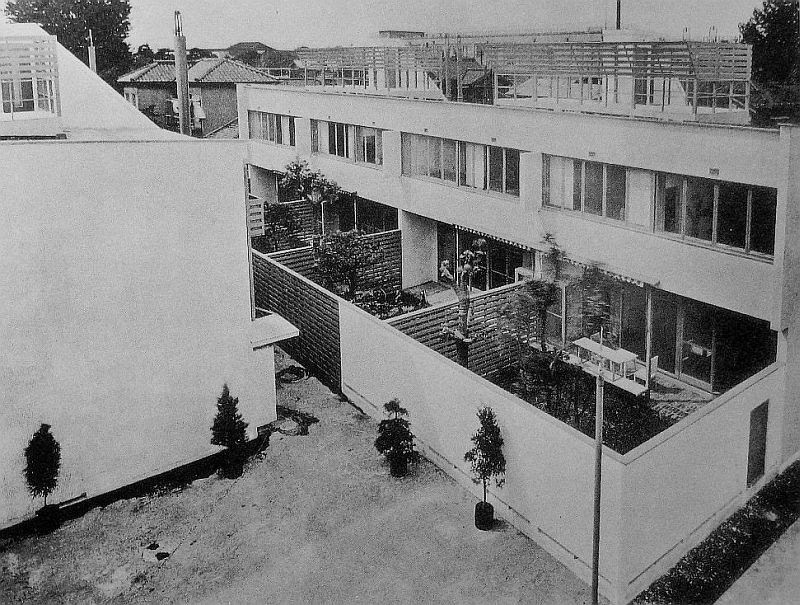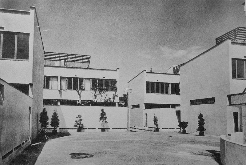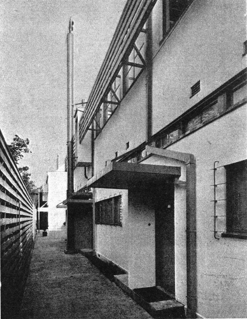 2階建連続住宅の各戸ごとに塀で区切られた庭がついている構成は,第二次大戦後にミース・ファン・デァ・ローエがデトロイトのラファイット地区の住宅団地で試みた方式の先駆的なものとみなされよう.