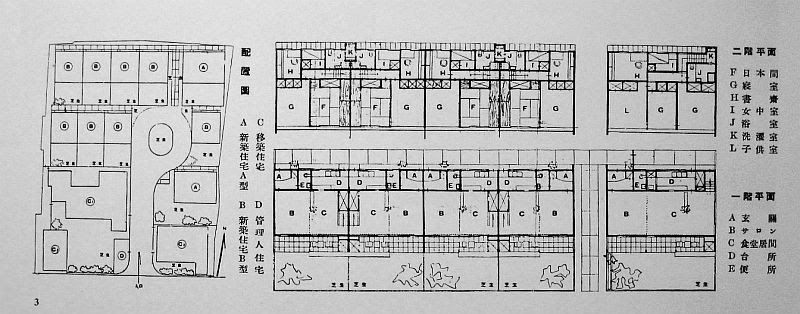 故有島武郎氏が生前の作品中に或は書簡文中に「番町の家」としてのせられ有名だった麹町区下六番町10の邸宅はその後一時文芸春秋社と平凡社が仮社屋に借りていたことがあったが最近は七百坪の名庭は荒れるにまかせペンペン草やあざみの花が咲いていたが、今度令弟有島生馬氏が同所に純独逸風の集合住宅「ジードルング番町の家」を立てることになり思い出の邸は沢山の鳶職が入って取り壊している。「ジードルング番町の家」は先日本紙に掲載した「町田外人街」と同様に在京外人、中流以上の人々に、ホテルより手軽に在来のアパートより一層機能的に、家一軒借りるより文化的な住み家を与へる目的で、青年建築家として水道橋の東京歯科医専その他進歩的なデザインで有名な山口蚊象氏がデザインに当り、ドイツのウォールグロッピュース氏流のテイピカルなジードルングの設計を終り目下建築許可の申請中で八月末日まで竣工の予定である。山口蚊象氏の設計によれば同住宅群はA一型、B二型の二種を基礎型として組み合わせたものでA一型は独立家屋、B二型は連続家屋として平面計画の有効面積は九十六パーセント、A一型は新夫婦に子供一,二名、B二型はそれより多い家族を収容しうるやうにし、階下は純洋風の居間、サロン、厨房、様式便所、玄関等を作り階上は洋風、和風二様式の寝室、二戸共同の洗濯場、物干場等の文化の粋を盡し、低圧温水暖房のセントラル・ヒーティングを採用したわが国最初のジードルングである。工費7万円内外で一棟一戸建て一つ、三戸建て一つ他は独立建てとし一四家族を収容し得るもので外装は総白タイル張り「町田外人街」よりなほ一層ユニーク外人街が出来上らうとしてゐる。