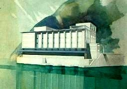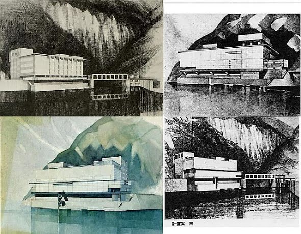 発電所については第一次案から第三次案まであって,決定案がインターナショナル・スタイルに収れんしている.第一次案はかなり,マッシィヴな案である.デザインの傾向からいえば,それぞれに表現は異なるが,発電所の建築の方は,幾何学的な構成で追求されていて,ダムの方は,スタティックなデザインからダイナミックなフォルムへと変っている.これは非常に興味深い面である.前に指摘したように,日本歯科医専でも,ともすれば,表現主義的なデザインが露出しそうな面があったが,この発電所とダムでも,山口の内部では,造型表現の相剋があったように推察される。
