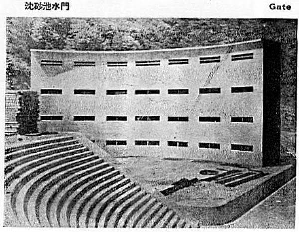 小屋平のダムサイトにある沈砂地とそれに附属した操作室のデザインは,いずれもコンクリート打放しで,しかも,随所に曲線や曲面のデザインが用いられている.戦後の打放しコンクリートのデザインを見なれた眼には発電所よりも,ずっと新鮮でダイナミックなデザインのように映る.
