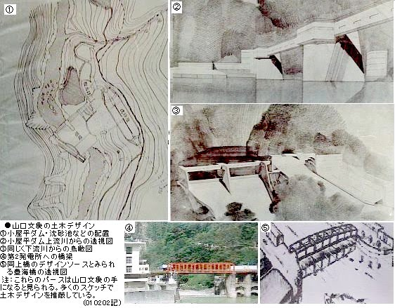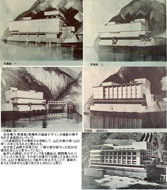 「山口は建築家としてかなり特色ある出発をしている。芸術運動における経歴ももちろん無視することは出来ないが、もっと直接的にその後の仕事の底流になったのは、土木の仕事への参加である。東京市復興局での橋梁デザイン(数寄屋橋)、ダム工事の付属施設、ダム自体のデザイン面の担当がそれである。黒部川ダムの発電所はその代表的なものである。実施案には表現上の制約があったにしても、その当時もっとも先鋭なデザインであったろう。