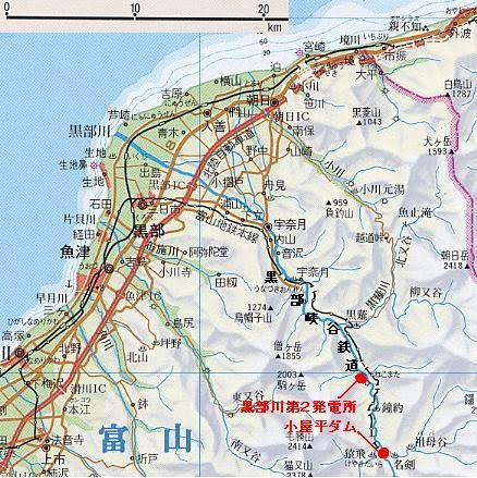 この堰堤のある小屋ノ平は、北陸線三日市で汽車を捨て、黒部鉄道に揺られて小一時間、うなつき温泉から更に「トロ」に托して二時間程度遡ったところにある。