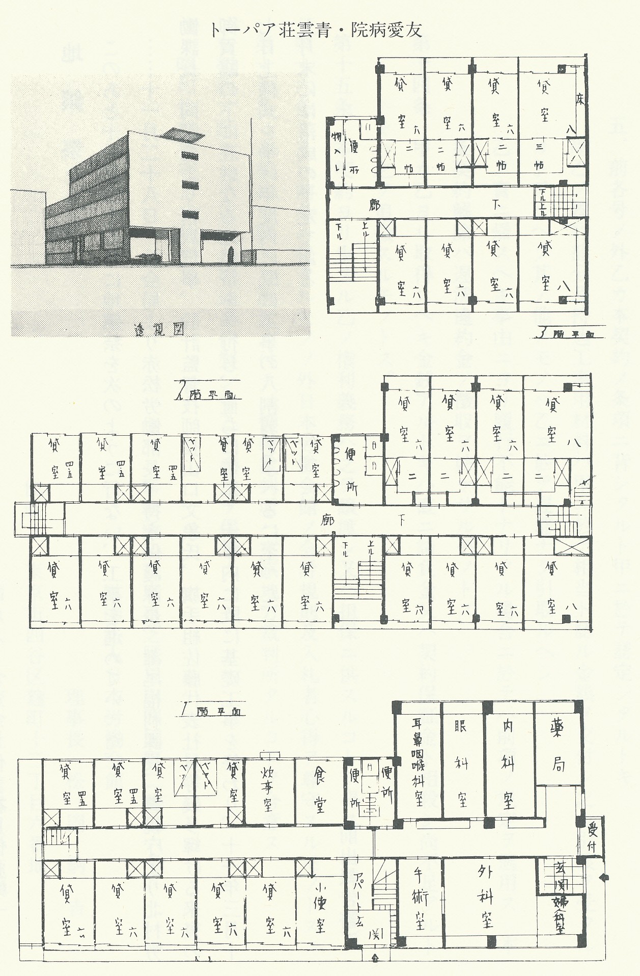 1934年 松岡駒吉が日本労働総同盟会長となる1936年 惟一館の隣に「青雲荘アパート・友愛病院」(設計:山口文象)を建設