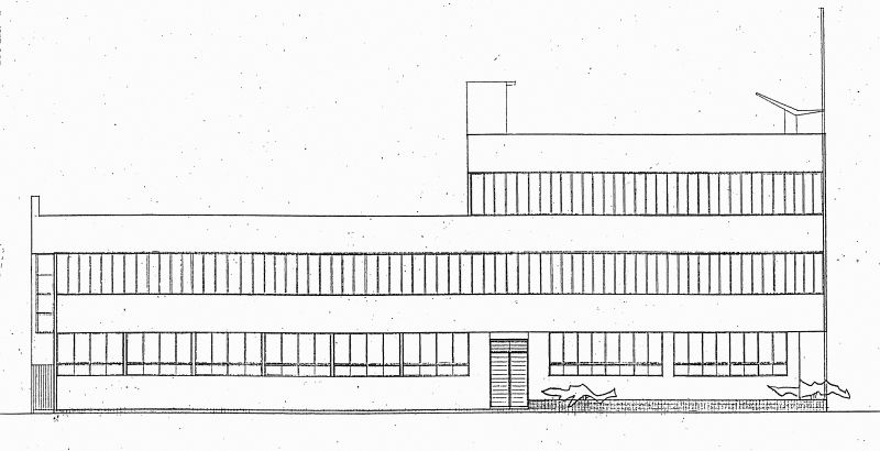 この建築は1階が友愛病院にあてられ,2階と3階は労働者向けのアパートであった.妻側は開口部の少ない壁面構成で,他は連続窓をもったごく明快なインターナショナル・スタイルである.建築の性格上からであろうか,まったくけれん味のないデザインでまとめられているのが,かえって印象に残るほどである.
