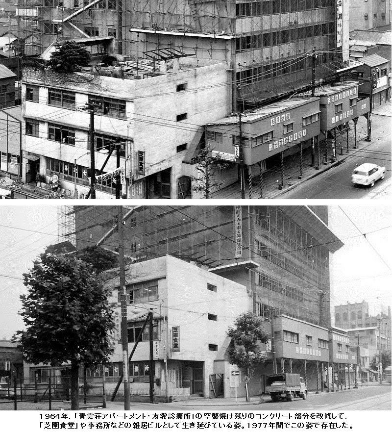 1945年 米軍機空襲で日本労働会館は炎上焼失、青雲荘は一部燃え残り