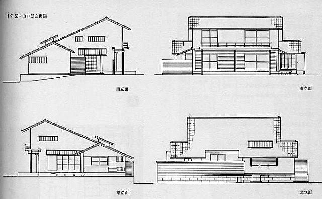 山口が,茶室から民家まで,伝統的な和風建築の研究を実作の上で研究し続けたことほ,彼の戦後の小住宅のデザインの上で興味深い成果となって結実する.木造建築のさまざまな技法や細部を完全に習得したものでなければ創出できない新しいデザインの展開は,戦前の研究に負うところが大きいのである.