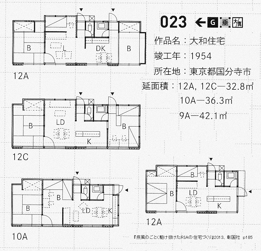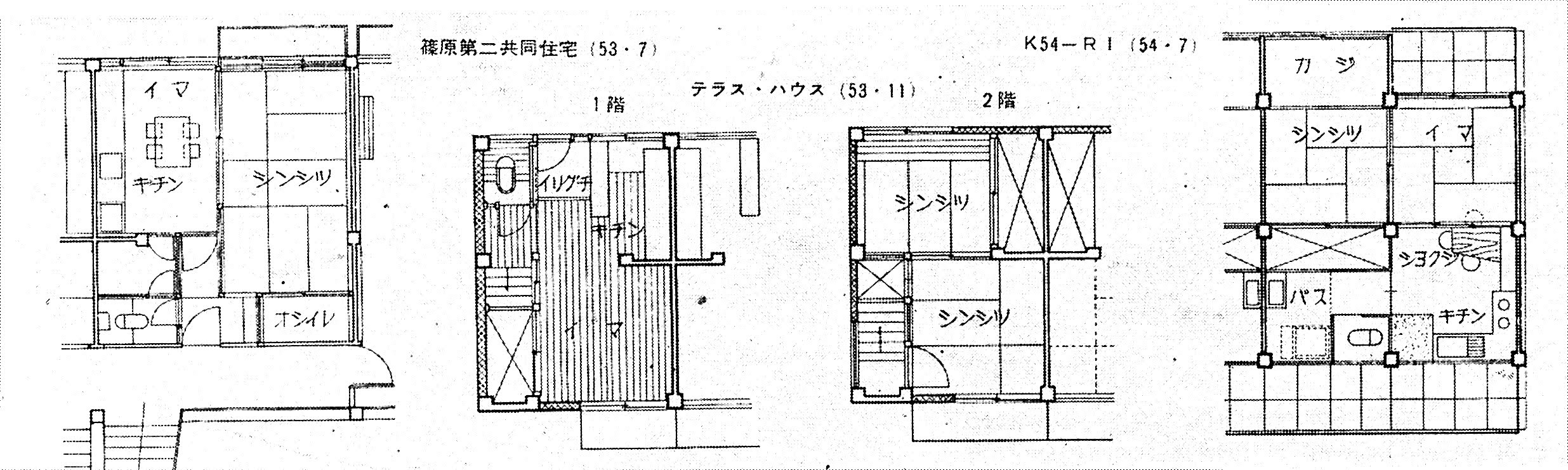 1954年,大和生宅協同組合の計画する20戸の都融資分譲住宅の設計をすることになった。融資は建築費の半額に充たず,土地を含んだ建設費も一戸あたり40~60万に抑えるというきりつめられた条件の枠で,9.75坪,11坪,12.75坪の3種の平面をつくり,建築費は坪当り31,000円程度に抑えた。内壁のパネル化はほぼ予定どおり実現され,現場運営も予期に近い成績てあったが,土地のコストを最低に抑えたため,求められた敷地はやや交通の便が悪かったことと,完成期がデフレ最低線をつくこの年の暮だったことなどの悪条件が重なり,一時は設計上の責任を感じる程に入居がおくれたが,最近漸く殆ど分譲し尽す状態になった。入居者とこの住宅との接触はしかし危惧されたいくつかのギャップも殆ど問題にならなかった。3Kハウスに比して数歩前進したこの平面計画は,ここで全く客観性を持っことになった。つまり特定の施主との接渉といういわゆる授業の段階をぬきにしたこのような住宅計画において,たしかな需要を得たということに私共は勇気ずけられる。