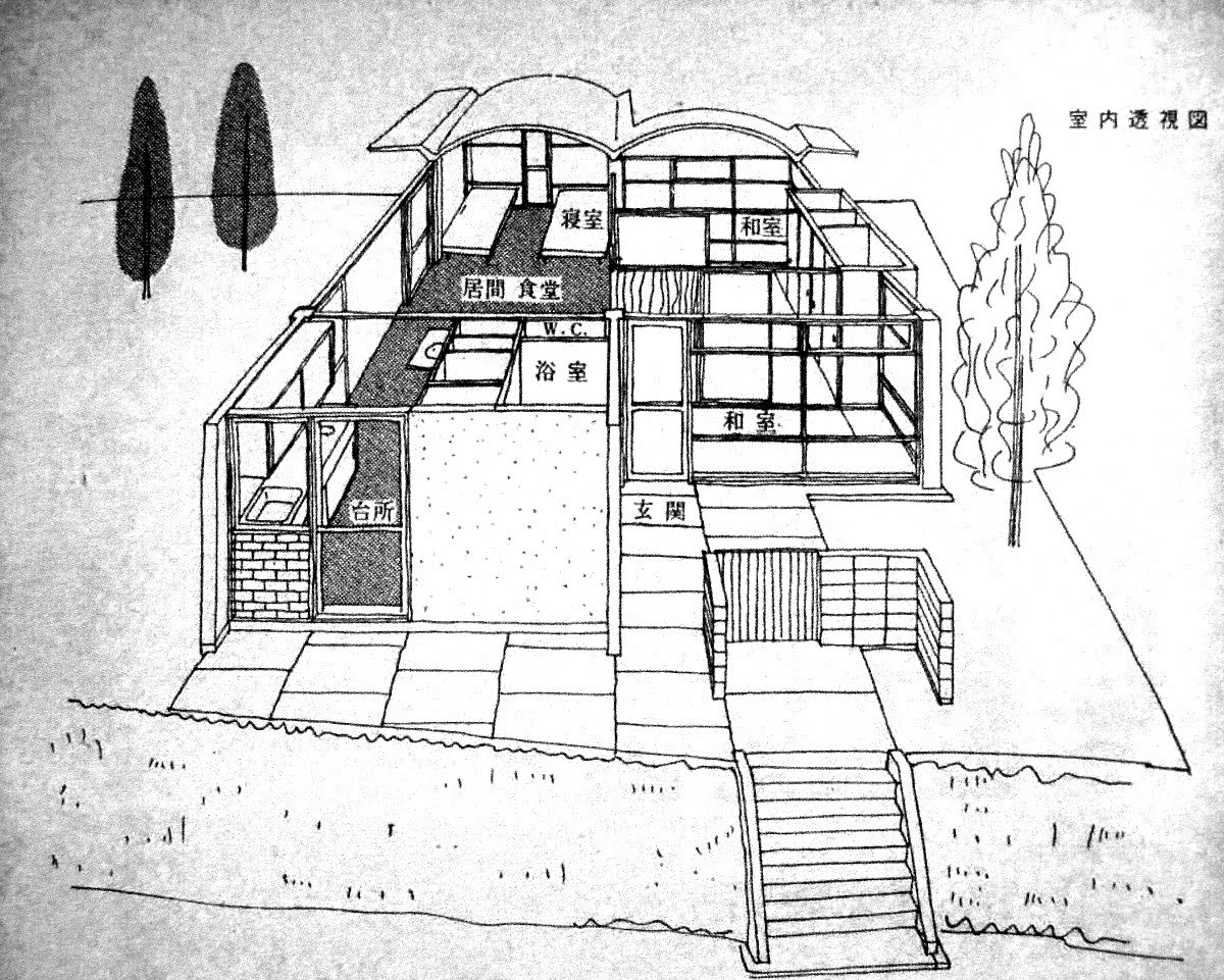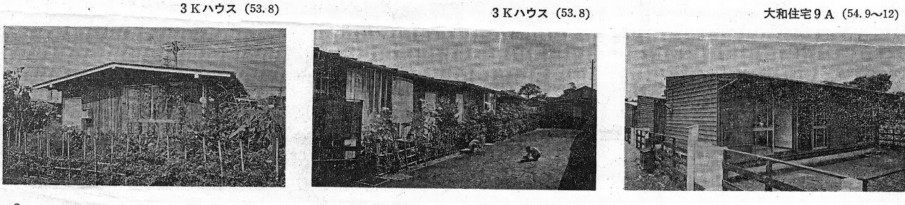 一九五三年(昭和二十八年)のK建設の3Kハウス12戸(土地を含んだ建設費八〇万―百四〇万、坪あたり三万五千円前後)の設計協力。続いて大和住宅生活協同組合の大和住宅二〇戸(土地を含んだ建設費四〇万―六〇万、坪あたり三万一千円程度、都融資分譲住宅、p185参照)の設計では、次の三点を設計要旨とした。