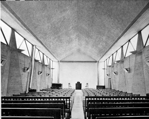 新しい礼拝堂は鉄筋コンクリート造で作られた。壁も屋根の折版で形成された構造体そのままの空間で構成された。