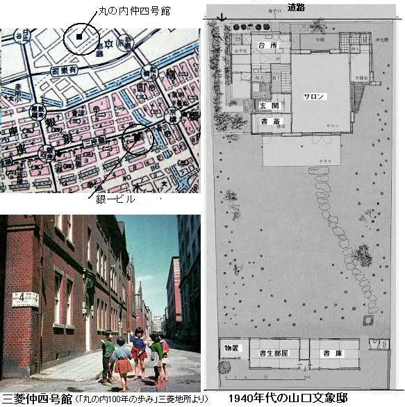 三菱仲四号館は有楽町駅からは程近いところにあり、赤レンガ造の2階建てのオフィスビルで床と屋根が木造であった。今のような廊下型ではなく階段アクセス型になっており、山口事務所はその玄関を入ってすぐ左にあった。戦後のRIAとなってから2階にも設計室ができたが、これはRIA創立メンバーの三輪正弘氏の父君の政治家三輪寿壮氏の事務所であったものである。