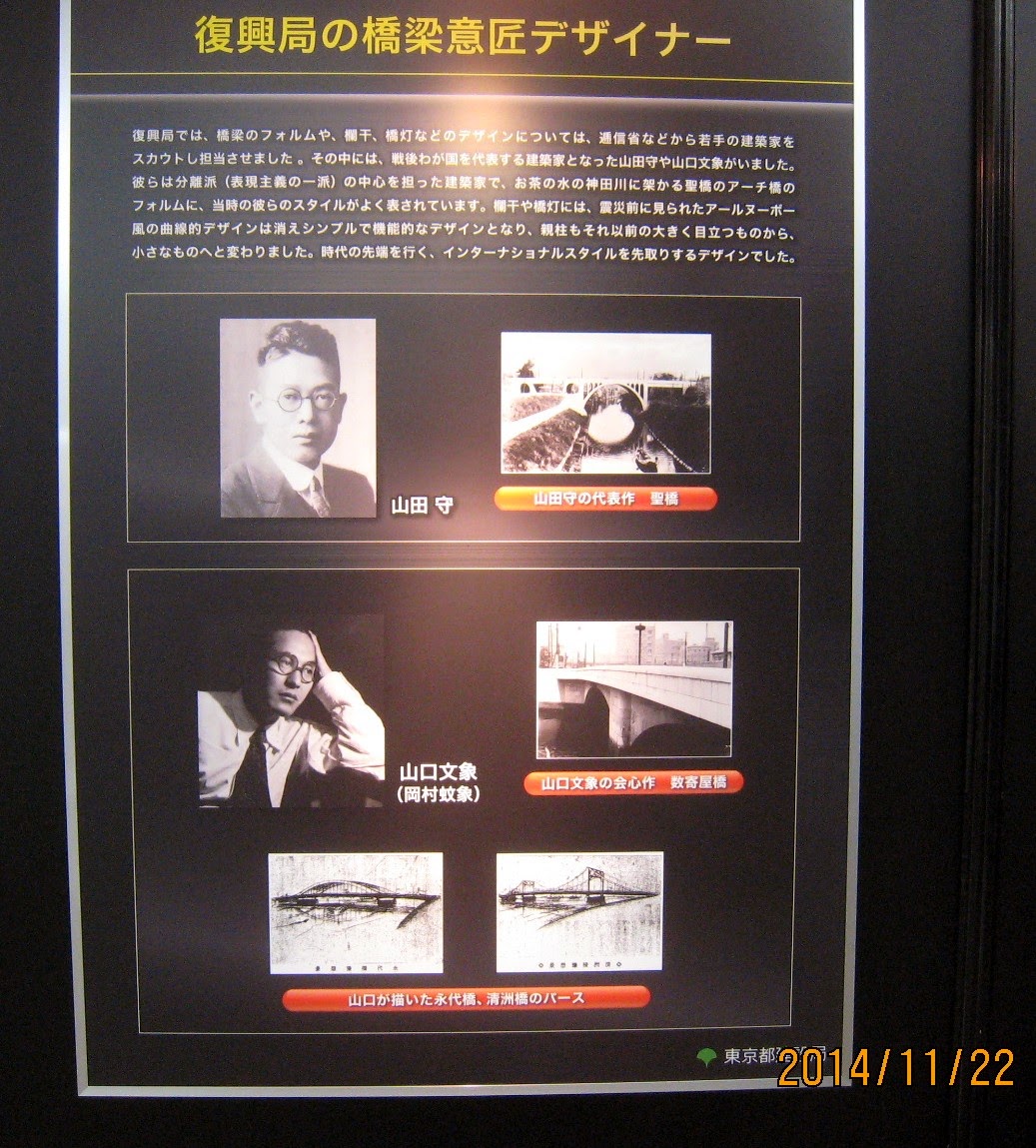 山口文象がかかわった土木構築物の内、上記の八重洲橋のほかに、清洲橋、数寄屋橋、そして富山県の庄川にある「小牧ダム」が展示されて、山口の名が記されていた。